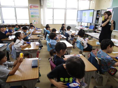 3年生、少人数教室と教室の2か所に分かれて、あまりのある割り算の学習をしていました。4年生は、外国語活動で、何時に何をするを英語で話す学習をしていました。ゲーム的な要素を入れながら、楽しく学習していました。