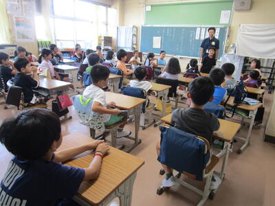 今日は朝からあいにくの雨模様でしたが、気温が下がり、熱中症の心配も減り、体も楽に過ごせました。1年生は、国語の「なつのおもいでをはなそう」で、夏休みの出来事を話す学習に取り組んでいました。姿勢もよく、しっかり挨拶ができました。