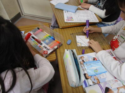 3年生、クラス全員で、道路をつなげて、マークシティーを作製していました。全員でつなげると一つの街になって楽しいですね。