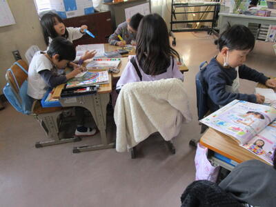 1年生、図工室で「ともだちとたのしくスタンプあそびをしよう」を目標に、大きな紙にグループの皆と協力して、自分でもってきたもので、スタンプをしていました。2年生は、教室で図工「いろいろもよう」でティッシュペーパーを2回折って、カラーペンで模様を描いて広げる活動をしていました。集中して、模様づくりをしていました。