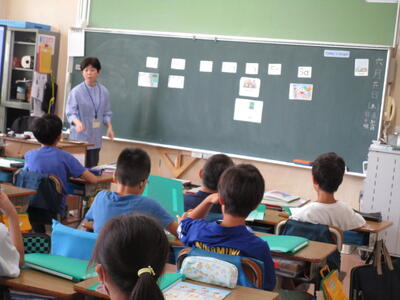 3年生、授業の開始時刻ぴったりに、体育館に集まって準備運動が始まりました。体育係さんたちが、はりきって前に出て準備運動をし、大きな声で、掛け声をかけていました。また、別のクラスでは、習字の授業をしていました、今日は、特別非常勤講師の先生が来校して、筆の使い方、始筆や終筆について、「一」の字を書いて指導していました。担任の先生も一緒に子供たちに個別指導していました。