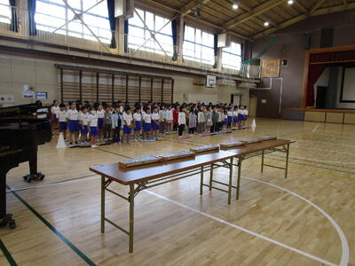 1年生、体育館で音楽会で発表する「こいぬのマーチ」(器楽)と「パームパーム」(斉唱)の練習をしていました。楽器の持ち方や移動の仕方もしっかりと確認していました。
