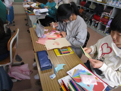 4年生、図工で飛び出すカードの仕組みを使って「音楽会」の招待状を作っていました。