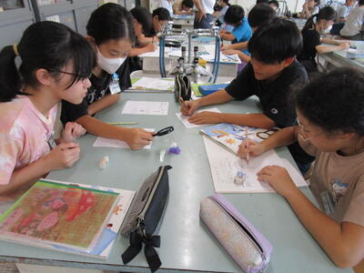 5年生、理科室でグループごとにアサガオのおしべとめしべの観察を虫メガネを使って行っています。とても、じっくり観察し記録していました。