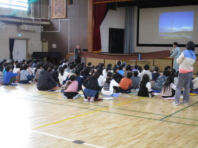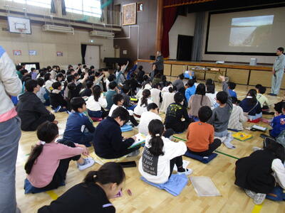 午後からは、4年生は建築業の方を招いての出前授業がありました。鋼矢板やかごマットなど、安全や自然を守る仕組みについて、実物やモデル、画像を見たりして様々な工夫を学びました。