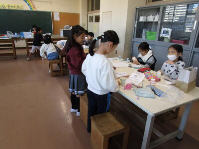 2年生、生活科で自分が選んだおもちゃ作りをしていました。「糸電話」「ぴょんぴょんがえる」などなど、子供たちは夢中になって作ったり、遊んだりしていました。