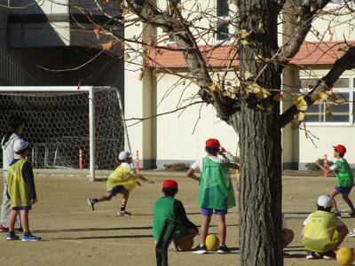 3年生、校庭でポートボールの学習をしていました。最初のころと比べると、パスやシュート、カットの仕方がとても上達しています。