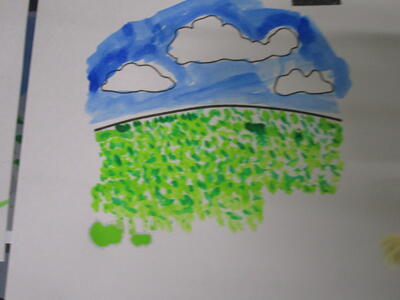2年生、大きな画用紙に動物の絵を描いています。背景の色を塗るのに、点塗やグラデーションのやり方を小さな紙で練習していました。