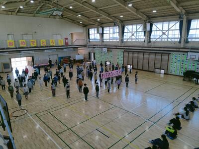 今日は、体育館で「卒業を祝う会」が行われました。オンラインと対面を活用して、6年生のみ体育館に残り、1~5年生は自分たちの発表があるときだけ、体育館に移動するという方法で実施しました。そして、教室にいるときは、オンラインで体育館の様子を鑑賞しました。
