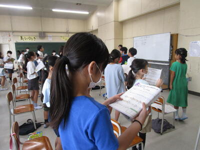 4年生、音楽室で「ゆかいに歩けば」を、スタッカートに気を付けて弾むように歌っていました。明るい歌声を聞いていると、こちらまで元気になりました。
