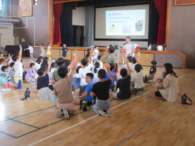 3年生の着衣泳は、あいにくの小雨模様のため、体育館で学年合同の1時間弱の座学になりました。地域のゲストティーチャーの方から、一人で絶対に水場に行かないことや、もし、おぼれたら、「浮いて待つ」ことを学びました。また、おぼれている人を見たら、大人を呼び、ペットボトル等、水に浮くものを投げることも教えていただきました。実際にペットボトルに水を1~2センチ入れ、それを溺れたと見立てた人に投げる実践も、代表で10名程度の児童や先生方が体験しました。