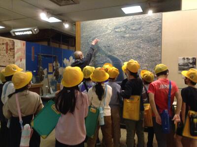 1枚目の写真は、考古博物館で説明を聞いているところです。コククジラの骨格模型が子ども達を出迎えてくれました。