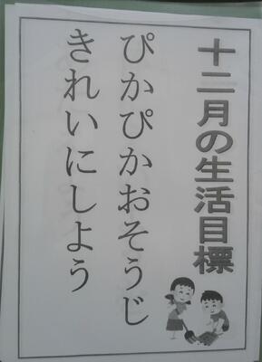 今月の生活目標は、「ぴかぴかおそうじ きれいにしよう」です。担当の先生からは、「だいじ」という合言葉を教わりました。