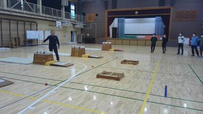 体育では、どのように用具を扱うかも授業づくりではポイントになります。研修中は、気分が楽しくなるようなBGMが流れていました。自然と明るい気持ちで取り組むことができます。