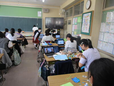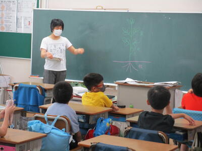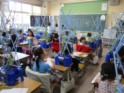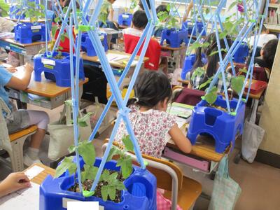 1年生、朝顔の観察をしていました。支柱の上までつるが伸びている鉢や花が咲いている鉢もあり、「大きくなったね」というととても嬉しそうな様子でした。子供たちは自分の鉢を机の上に置き、丁寧に観察カードをかいていました。