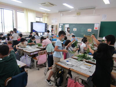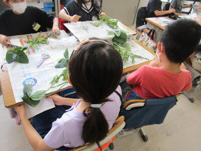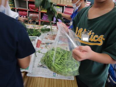 3年生、給食で提供する枝豆のさやもぎをしました。栄養士の先生から、枝豆のなりかたや、枝豆が大豆になる話を聞いた後に、葉や枝付きの枝豆の観察をしました。そのあとにはさみでチョキチョキとさやを切りました。今日の給食が楽しみです。