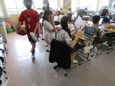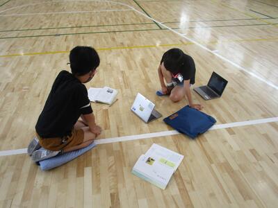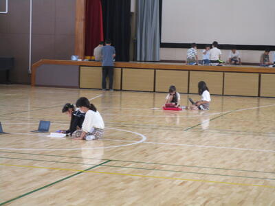 4年生、体育館で、国語の落語「ぞろぞろ」の学習です。二人一組になって、話し手と聞き手にわかれ、聞き手が話し手の話(好きな場面)を録画しています。子供たちとても熱心に取り組んでいました。自分の話を録画で、振り返りをするそうで、とてもいい学習になりますね。