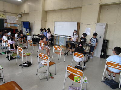 3年生、音楽で木琴に取り組んでいました。バチをもって、交代で合奏していました。リズムよくたたく音色が響いていました。