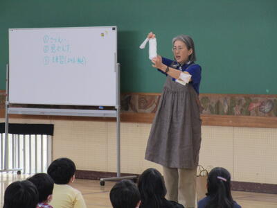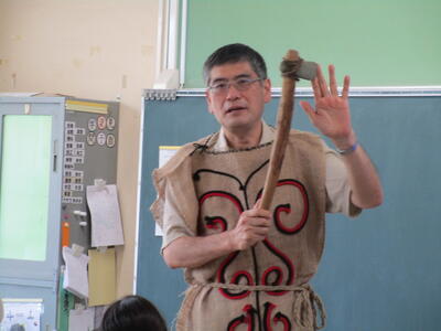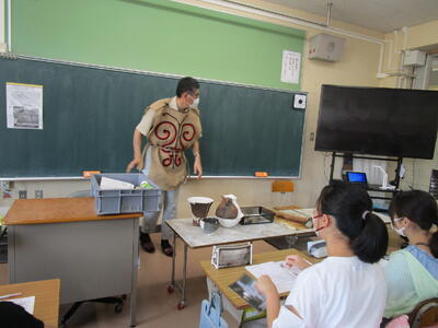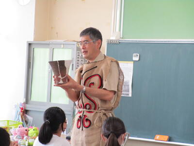 6年生、考古博物館の学芸員さんが、市川市の縄文時代の様子について、授業をしてくださいました。縄文人の服を着て、土器や石器を持参して、スライドも使い、わかりやすく、そしてとても詳しくお話してくださいました。大和田小のあたりも海だった時期があり、地下からカキの殻がでてきた話や、駅の近くの本局の郵便局あたりから、鯨の骨(考古博物館の入り口に飾られている)が出てきた話など、子供たちも興味をもって聞いていました。