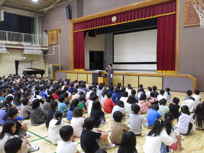 前期終業式が、体育館で全校で行われました。4年ぶりの全校児童による「校歌斉唱」があり、体育館にきれいな歌声が響きました。校長先生からは、全校児童が4月から今日まで学習や生活で目標をもって頑張りましたということ、そして「ウサギとカメ」の話からこれからも自分なりの目標をもって頑張る事の大切さの話がありました。