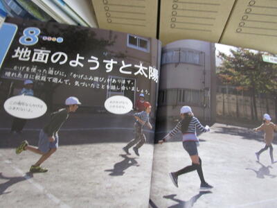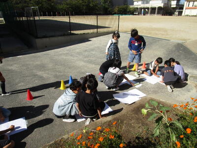 3年生、理科の「地面の様子と太陽」で太陽の動きを調べるため、班ごとに棒を立てて、影の動きを観察しています。1時間ごとに記録するようです。