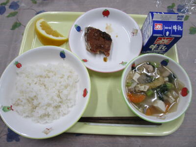 今日の献立は「ピースご飯」から「ご飯」へ変更になっています。カツオには、皆さんの体の「筋肉」や「内臓」を作る材料である「たんぱく質」がたくさんふくまれています。また、生のカツオを見てみると、とても濃い赤い色をしています。これはカツオの筋肉の中に含まれる「鉄分」の色です。鉄分は「貧血の予防」などに効果があります。