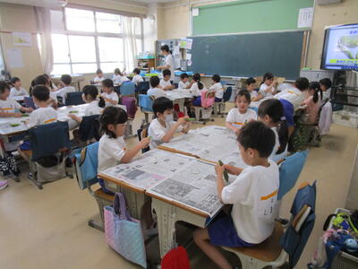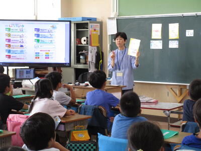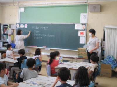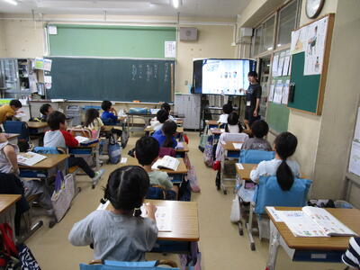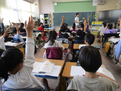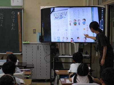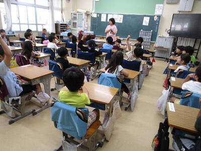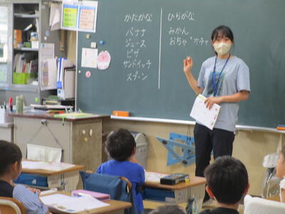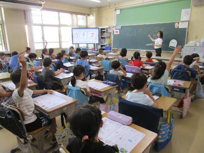 1年生、カタカナの学習で、カタカナで書く言葉とひらがなで書く言葉を確認していました。隣のクラスでは、先生が「実際に『ス』の付く言葉でカタカナで書く言葉をあげてみましょう」と言うと、子供たちは「テニス」「スイカ」などたくさんの言葉を発表していました。