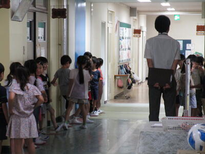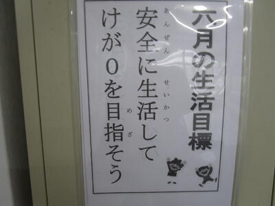 3年生、朝の会の時間に、今日は全校放送で今月の目標の話がありました。今月の目標で特に気を付けたいことを全校に呼びかけました。教室では、担任の先生が放送の話を聞いて、クラスで確認していました。「どんな話でしたか」と聞くと「廊下や登下校中は走らない」「砂場や鉄棒のところでの鬼ごっこは、けがにつながる」「ほかのクラスの子とぶつかって、相手が転んだら、二人で一緒に担任の先生や保健の先生に伝えにくる」など、様々な内容の確認ができていました。