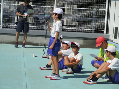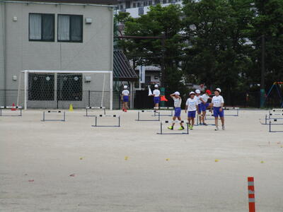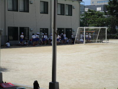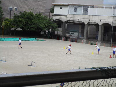 6年生、校庭で「ジャべリックボール」を使って投げる練習をしていました。次に日陰に行って、説明を聞き、走る前の準備運動をしてからハードル走の練習です。今日は暑いので練習の合間に自由に水分を補給しながら、学習に取り組んでいました。