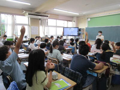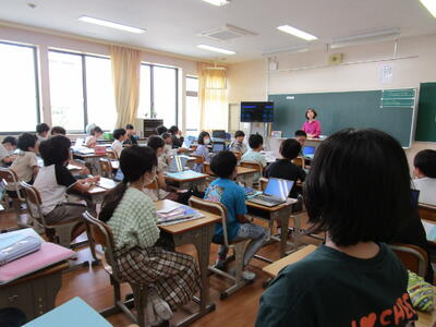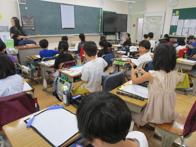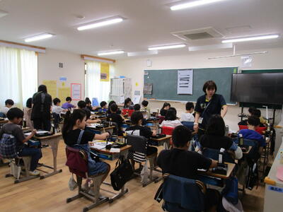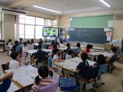 5年生、理科専科の先生と、発芽の条件をかえたもの2つを比べると、どこが違うのか、皆で意見を交流していました。ABCルームでは、別のクラスが英語専科の先生と自分の誕生日について、一人ずつ英語でやり取りしていました。