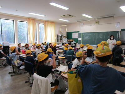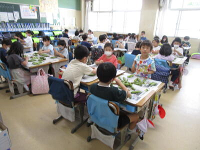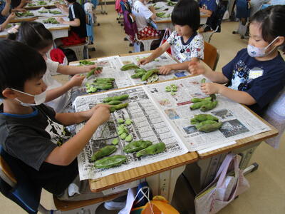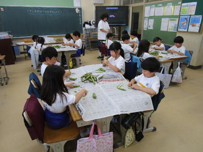 1年生、今日の給食で提供される「そら豆」のさやむきを各教室でやりました。栄養教諭の先生が作った動画を見て、先生から「大和田小の給食室は、大和田小と六中の給食を作っているので、併せて1350食分です。そのそら豆のさやむきを、今日は手伝ってもらえますか?」と聞かれると「はい」と元気に答える子供たち。最初は観察をして、その後、むき始めました。始めたころは、むくのがとても大変そうでしたが、何個かやるうちにどんどんうまくなりました。「さやは固いけど中はふわふわだ」「そら豆にも赤ちゃんがいるよ」などたくさんの発見をしていました。