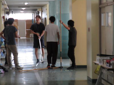 6月20日に行われる防犯避難訓練のための練習として、不審者を教室に侵入させないためにバリケードを作ったり、女性教員のクラスへ移動したりしました。1年生の様子を見に行くと、なぜ訓練をやるのか、どんな風に行動するといいのかを丁寧に事前指導していました。放送があると、どの学年も教室に鍵を閉め、バリケードを作り、息をひそめて、身を守っていました。男性教員は、不審者対応のため、さす股をもって、現場に集合し、さす股の使い方等の確認をしていました。