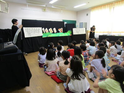 2年生、きらきら星おはなし会がのびのびルームでありました。「わたしのワンピース」では、主人公のうさぎちゃんの着るワンピースが背景と同じに変化していくお話で、子供達も、模様が変わっるたびに笑っていました。「ともだちほしいな おおかみくん」は、うさぎやきつねたちに怖がられていたおおかみが、最後にはほかの動物たちと仲よくなるお話です。ペープサートで、動きもあり、最後に歌を歌う場面では、子供たちも拍手をしながら、大きな声で歌っていました。とても、素敵な時間でした。