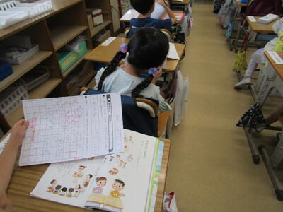 1年生、国語の「せんせい、あのね」の学習で、一人ずつ書いたワークシートが配られていました。サッカーをやったこと、牧場に行ったこと、おもちゃを買ってもらったこと、ダンスの発表会のことなど、子供たち、いろいろなことを書いていました。