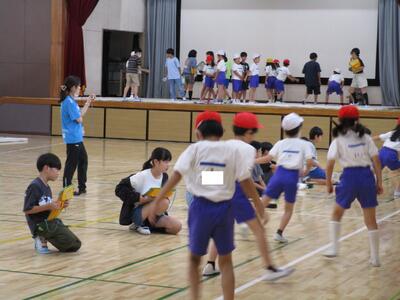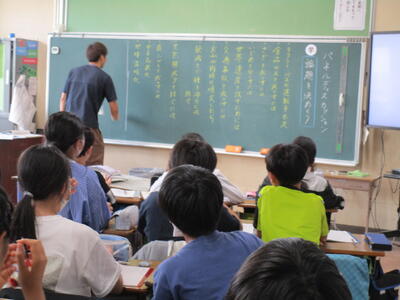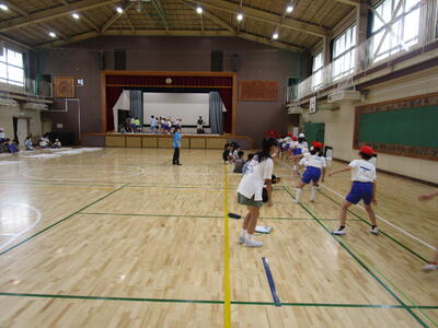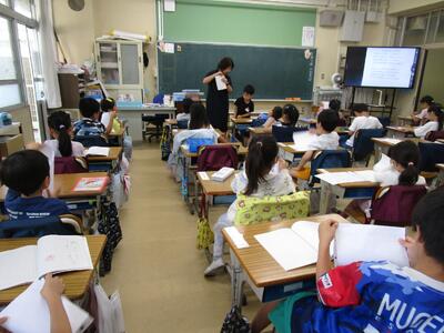 3年生、授業の開始時刻ぴったりに、体育館に集まって準備運動が始まりました。体育係さんたちが、はりきって前に出て準備運動をし、大きな声で、掛け声をかけていました。また、別のクラスでは、習字の授業をしていました、今日は、特別非常勤講師の先生が来校して、筆の使い方、始筆や終筆について、「一」の字を書いて指導していました。担任の先生も一緒に子供たちに個別指導していました。