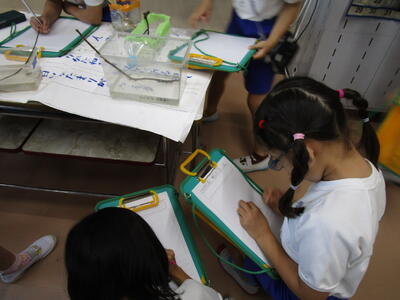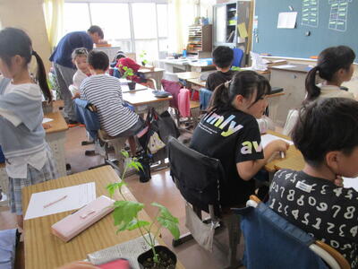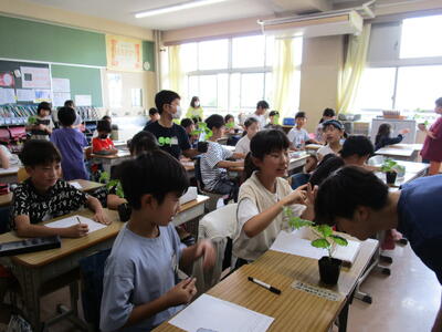 4年生、理科でツルレイシの苗を観察していました。観察を始めると、葉の枚数を数えたり、苗の大きさを定規を使って測ったりしていました。先生が「手触りやにおいも大事なポイントです」というと、触ったり、においをかいだりして「オクラの匂いだ」「ゴーヤの匂いだ」などつぶやいていました。