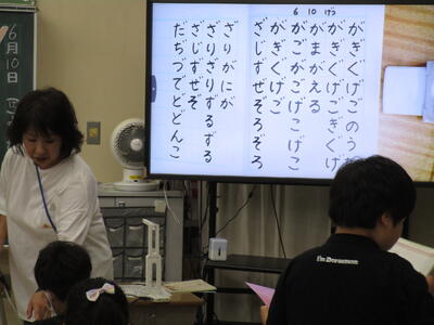1年生、国語の「がぎぐげごのうた」をノートに試写していました。先生が子供たちと同じように試写しているノートが、前の大画面に拡大されていて、子供たちも教科書を見て写しながら、時々前の画面を見て確認していました。