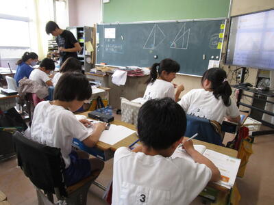 4年生、算数で分度器の学習を教室と少人数教室の2か所に分かれて進めています。三角定規の角度を自分で測って確認してから、三角定規を使った問題にチャレンジしていました。一つの教室が十数名なので、先生の目も行き届きやすいです。