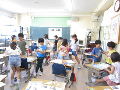 2年生、市川市90周年記念の缶バッジを作っていました。機械でプレスするのは力がいるので、5年生が一緒にお手伝いをしていました。