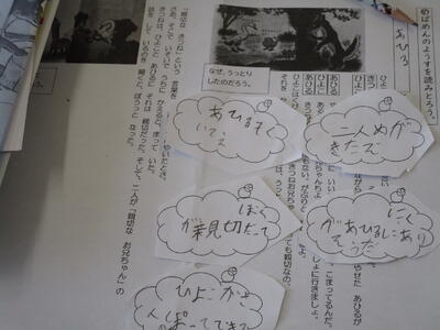 2年生、国語の「きつねのおきゃくさま」で、場面ごとのオオカミの気持ちをふきだしに書いています。書いたふきだしをもって、友達と交流していました。「