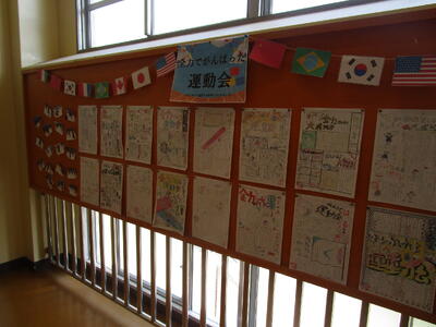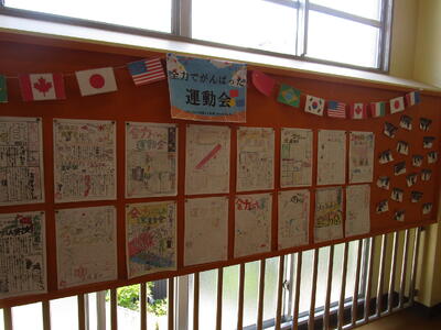 5年生、階段の踊り場に運動会新聞が掲示されていました。見出しや割り付けなど、とても工夫されていました。両脇には、子供たちが頑張って踊っている写真があり、見入ってしまいました。