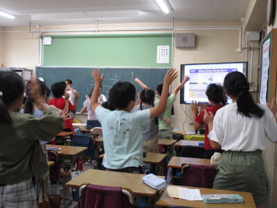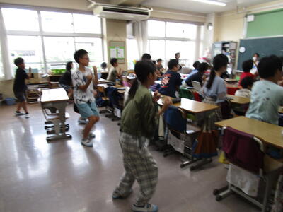 5年生、クラスのお楽しみ会で踊る曲の練習をしていました。皆、のりのりで踊っていました。
