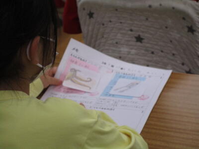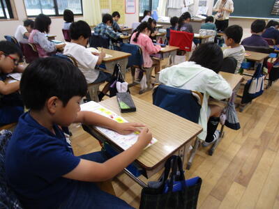 1年生、生活科で朝顔を育てていて、その様子をワークシートにかいていました。よく見られるように鉢を自分の横に置き、つぼみを中心に観察していました。2か月ですっかりと大きくなり、花が咲いている子もいてとてもうれしそうです。4枚目なので、カードの書き方も上手になりました。ある児童のカードをそのまま紹介します。「つぼみのかたちは、まるほそいです。つぼみのかずは、11こです。つぼみのみためは、けむしみたいです。」表現力が豊かですね。