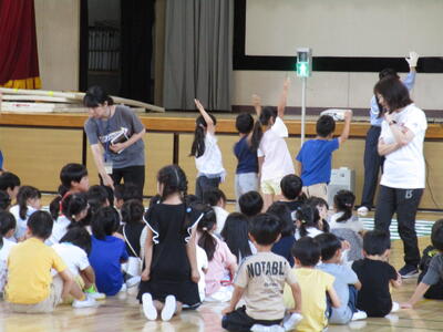 業間休み、きらきら星さんが、佐野洋子作「おじさんのかさ」の絵本を読み聞かせをしてくれました。梅雨の時期にぴったりな、雨を楽しめるような内容でした。途中、子供たちも一緒に声を出したり、笑ったりと、とても素敵なひと時でした。きらきら星さんの業間読み聞かせは、実に5年ぶりだそうです。今日は、雨も降っていなかったのに大盛況で、満員でした。