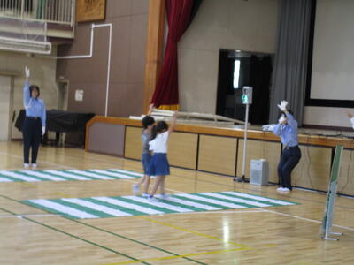 今朝、保護者の方が「カバンにカバーがついていたので、多分1年生の児童だと思われますが、保健センターの前の道路を飛び出して、車にクラクションを鳴らされていて危なかったので、学校に伝えに来ました。」ということがありました。タイミングよく、今日は、1年生が交通安全教室があったので、道路の歩き方、飛び出しはしない、横断歩道を渡るなどのルールの確認や実際に横断歩道の渡り方を、全員が確認しました。