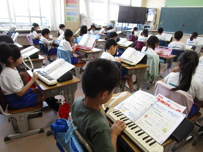 2年生、国語「きつねのおきゃくさま」で、キツネになりきって、音読練習をしていました。みんな、自分の作ったお面を嬉しそうにつけて読んでいました。また、隣のクラスでは、音楽で「かっこう」を練習していました。