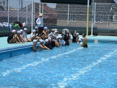6年生、先週プール開きをしたので、今日は早速、プールサイドに腰かけての水のかけっこやバタ足、水中じゃんけんなど水慣れをしていました。地域のボランティアの方2名も、皆が安全で楽しく水泳学習ができるように一緒にお手伝いをしていました。6年生、元気いっぱいです。