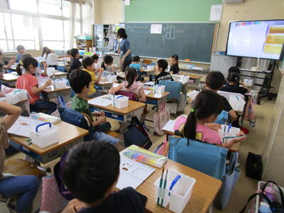3年生、漢字の学習を書き順をしっかり全員で確認していました。隣のクラスでは、国語で「生き物ブックをつくろう」をゴールにして、調べ学習をしてワークシートを書いていました。タコの足、いかの足を比べている子や、生き物の羽を比べている子、足の速さを比べている子など、一人ひとりのテーマが違っていて、クラス全体でまとめたら、とても楽しい生き物ブックができそうです。