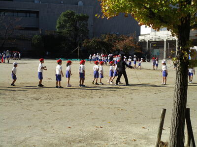 1時間目、久しぶりの晴天の中、校庭では1年生2クラスと3年生1クラスが大縄跳びの練習をしていました。1年生は、担任の先生がゆっくりと縄を回していました。3年生は、2か所に分かれて、速いペースで縄を回していました。4年生は、高跳びの練習をしていました。