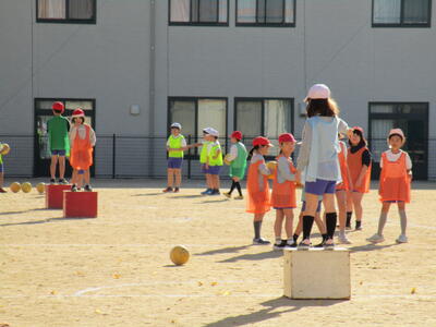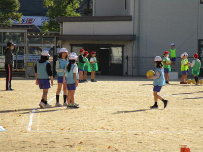 3年生、校庭でポートボールのパスやシュートの練習をチームで協力してやっていました。